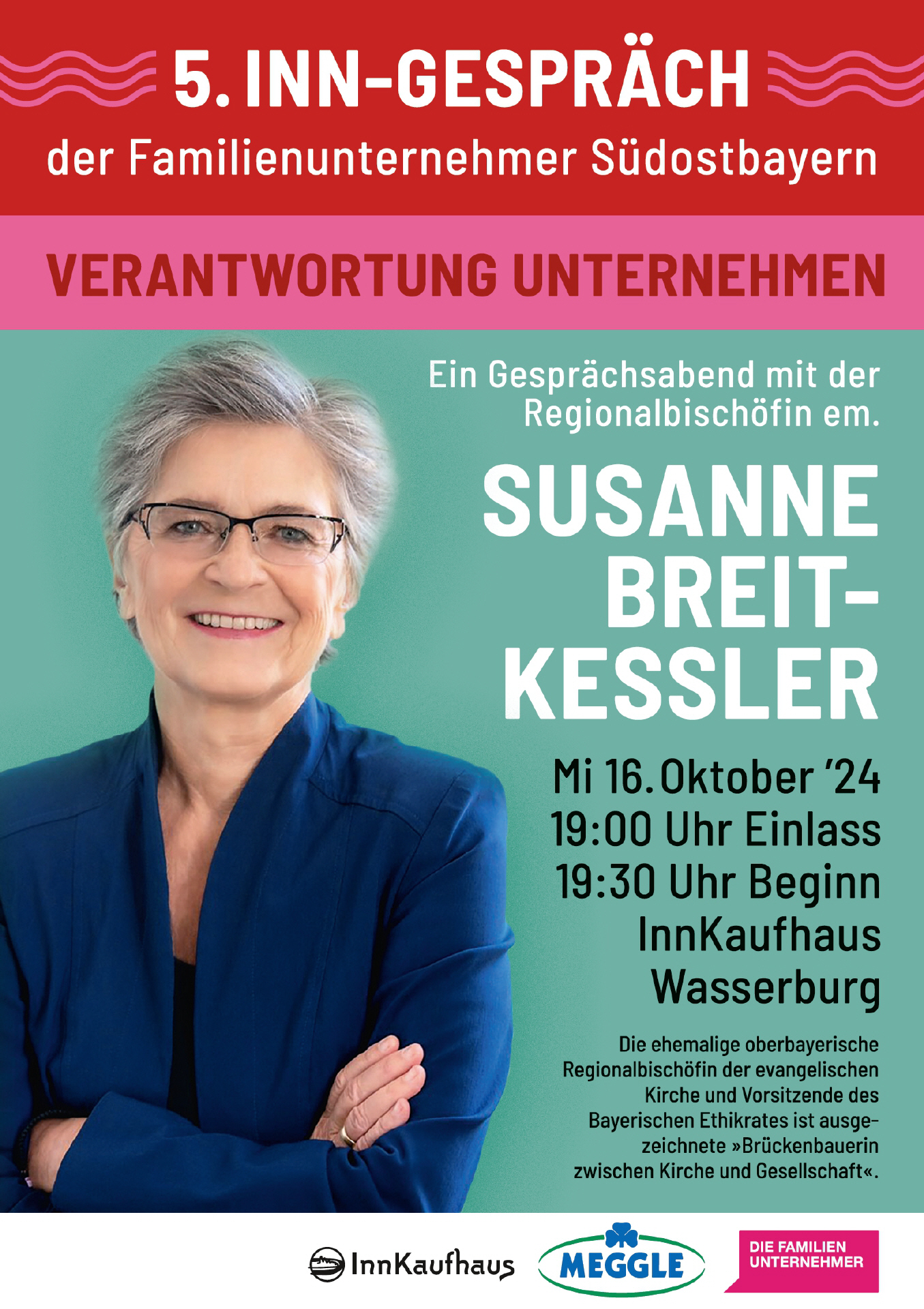 Die Familienunternehmer Südostbayern im Gespräch zum nachhaltigen Zusammenwirken von Wirtschaft und Gesellschaft mit ganz besonderen Persönlichkeiten. Dieses Mal mit der ehemaligen Regionalbischöfin der Evangelischen Kirche in Bayern und aktuellen Vorsitzenden des Bayerischen Ethikrates Susanne Breit-Keßler.