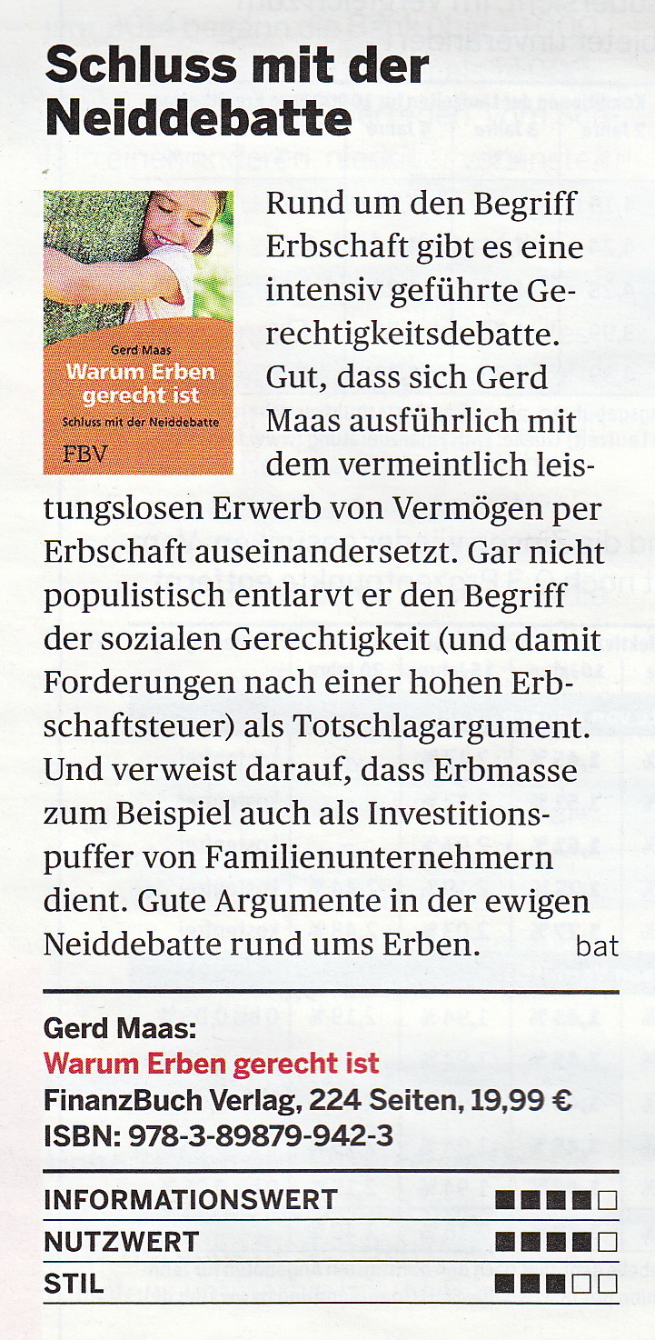 »Mehr Wirtschaftswachstum wagen – Plädoyer gegen die Erbschaftsteuer«. Unter diesem Titel rezensiert der Chefredakteur im Heft 5/2016: „Gerd Maas legt in seinem Buch »Warum Erben gerecht ist« zahlreiche Fakten auf den Tisch, die klar darlegen, dass der von interessierter Seite geschürte Sozialneid gegenüber Erben kontraproduktiv ist.“